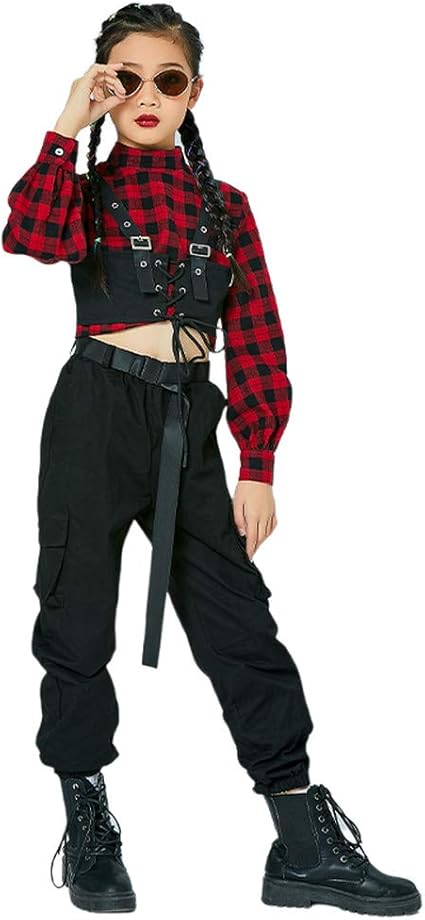 Amazon Co Jp キッズダンス衣装 ヒップホップ チェック柄へそ出しトップス ズボン 女の子 チアガールダンス 衣装 ジャスダンス衣装 ヒップホップ 子供服 練習服 ダンスウェア ジュニア Jazz Hiphop 団体服 演出服 ズボン ベルト 1 服 ファッション小物